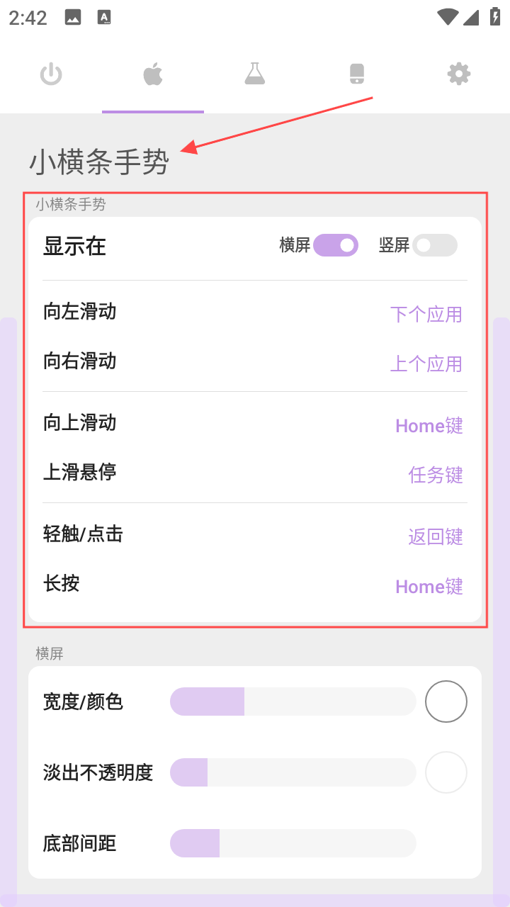 2、進(jìn)入小橫條手勢設(shè)置頁,選擇橫屏或豎屏顯示模式,接著自定義向左、向右、向上滑動等手勢對應(yīng)的系統(tǒng)功能,如切換應(yīng)用、模擬Home鍵等,完成小橫條手勢功能配置。