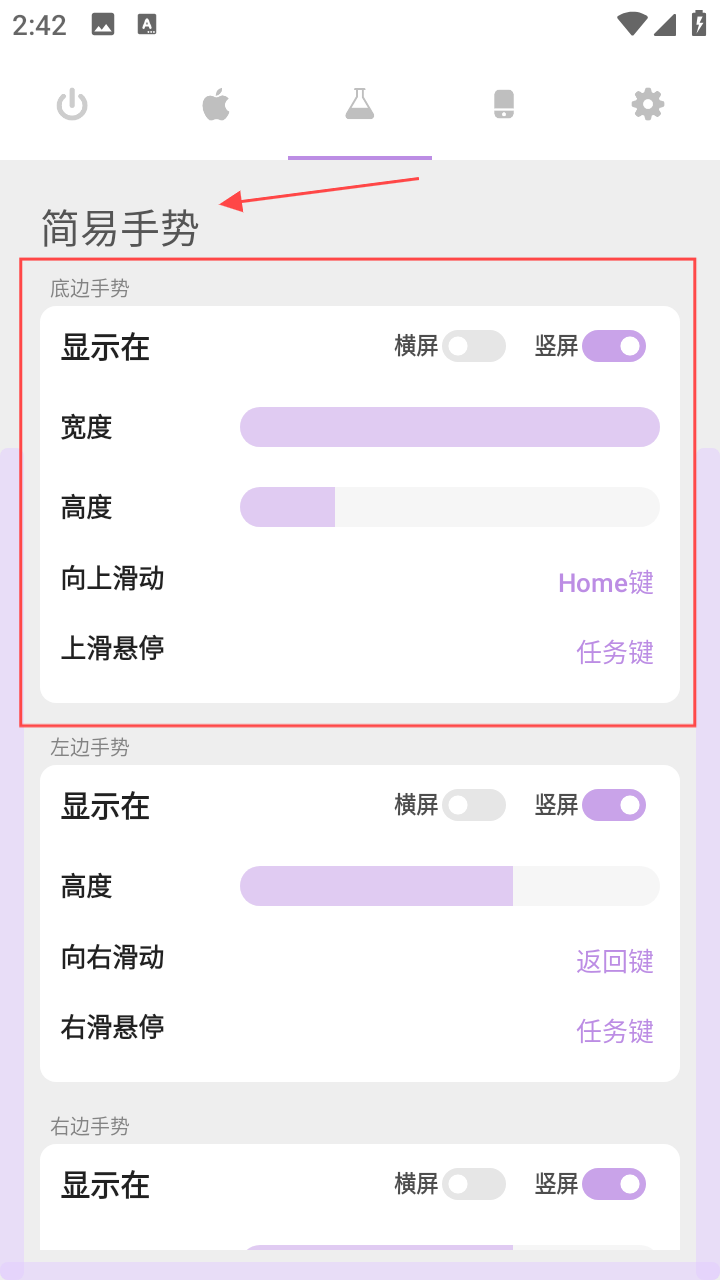 3、進(jìn)入簡易手勢板塊,分別對底邊、左邊、右邊手勢進(jìn)行設(shè)置,調(diào)整顯示模式、寬高參數(shù),定義向上滑動、懸停等操作對應(yīng)的功能,讓手勢操作貼合個人使用習(xí)慣。