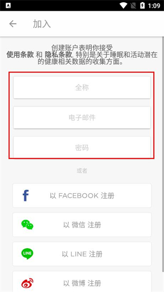 1、打開Misfit APP,在啟動頁面點擊加入,進入注冊頁面。