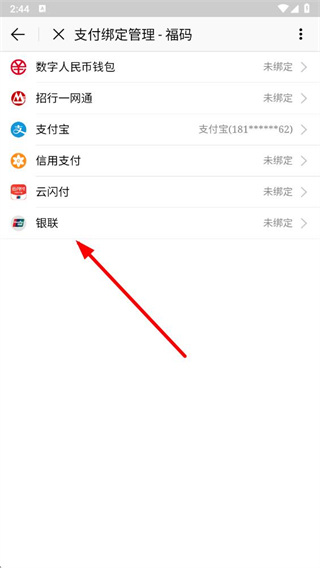 3、在支付綁定管理頁面點擊銀聯(lián)選項,進入銀行卡管理頁面。