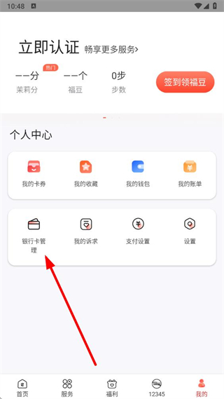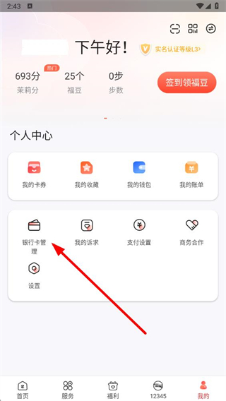 2、在個人中心頁面點擊銀行卡管理選項,進入支付綁定管理頁面。