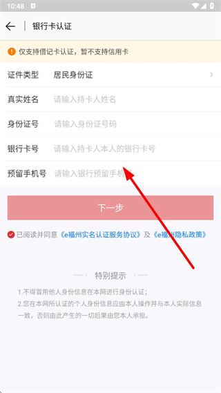 4、在銀行卡認(rèn)證頁面,依次填寫個人信息,勾選同意協(xié)議后,點擊下一步,完成銀行卡認(rèn)證流程。