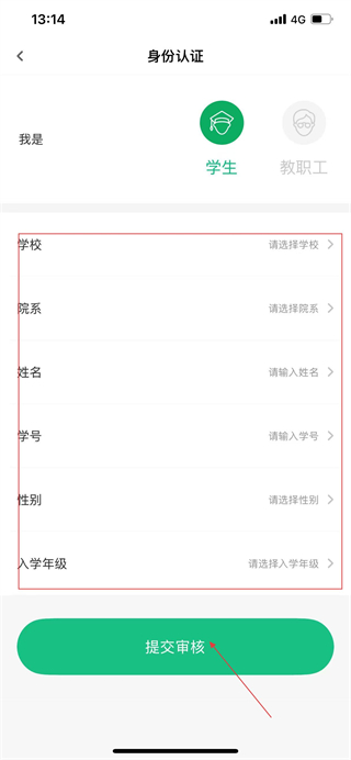 3、選擇學生身份,填寫學校等信息后,點擊提交審核,即可完成學校認證申請。