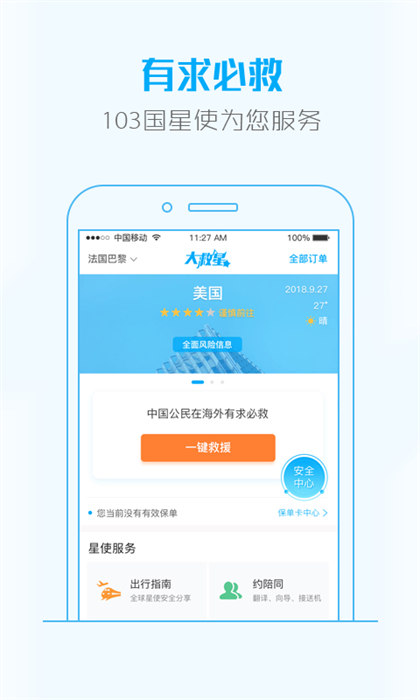 大救星中國公民全球領先救援平臺; 一鍵救援在您身邊,出行過程中遇到危險,只需要一鍵求助,系統(tǒng)將您的求助信息發(fā)送到附近的當?shù)胤照撸照邔⒃?0分鐘之內到達您的身邊,并協(xié)助處理您所需要的各種服務。