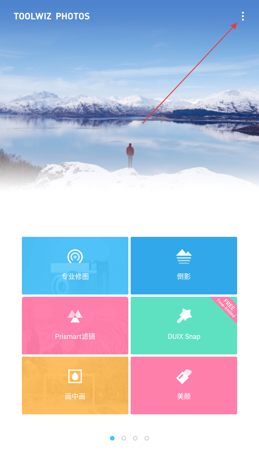 1、打開Toolwiz Photos應(yīng)用,點(diǎn)擊界面右上角的三點(diǎn)圖標(biāo),彈出功能菜單。