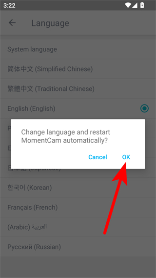4、在提示框中點(diǎn)擊OK,即可完成魔漫相機(jī)APP中文模式的切換操作。