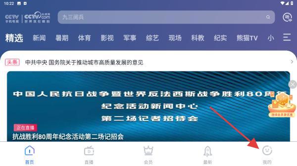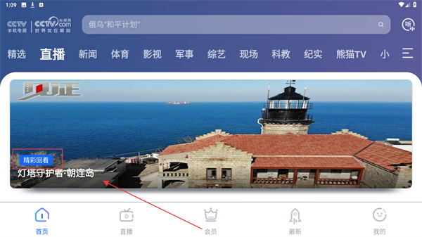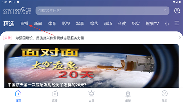 1、打開(kāi)cctv手機(jī)電視APP,在首頁(yè)上方點(diǎn)擊直播的標(biāo)簽。