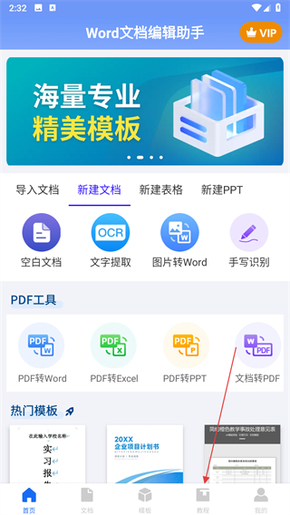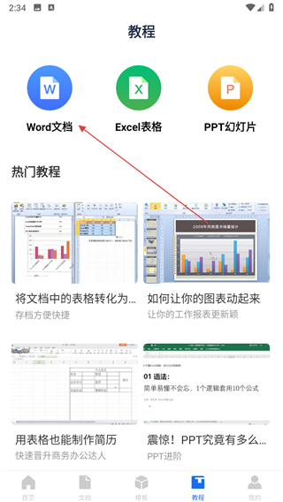 1、打開(kāi)Word文檔編輯助手應(yīng)用,點(diǎn)擊底部的教程選項(xiàng)。