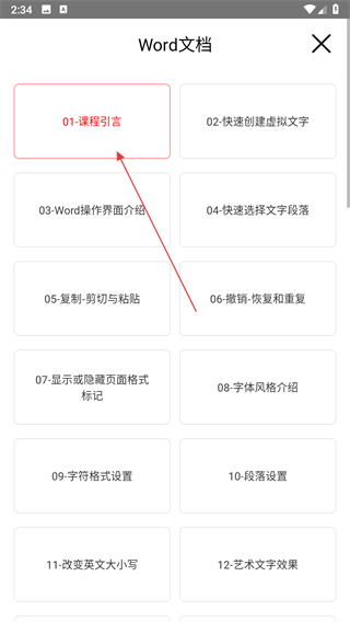 3、進(jìn)入Word文檔教程列表后,選擇想要觀看的教程。
