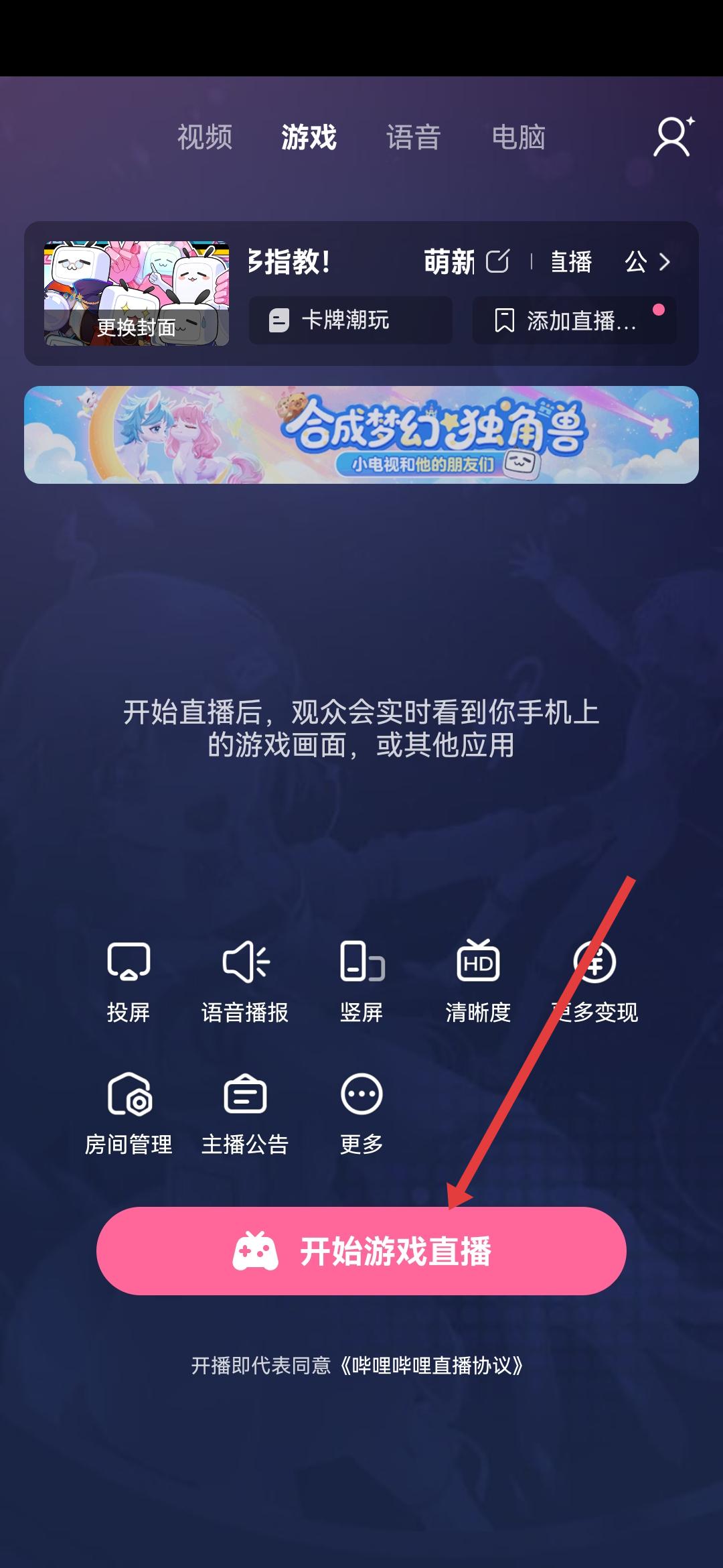 3、進入嗶哩嗶哩的直播界面后,需要點擊底部的語音播報選項。
