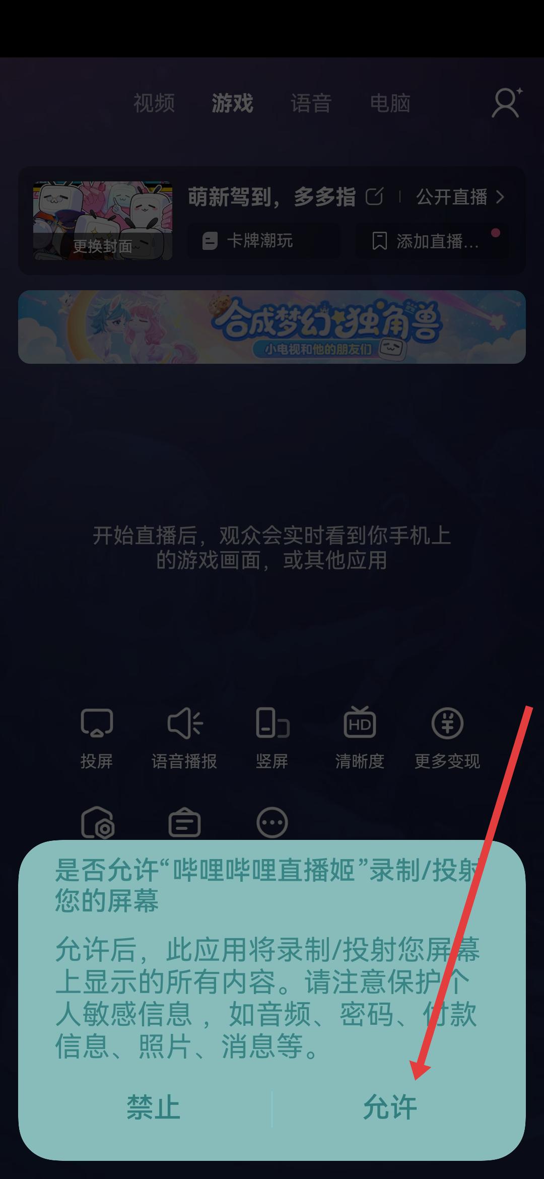 2、當(dāng)彈出是否允許嗶哩嗶哩直播姬錄制/投射您的屏幕提示時,這邊點擊允許。
