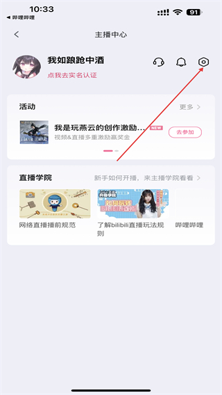 2、進入直播中心的界面內(nèi),再點擊設(shè)置的功能按鈕。
