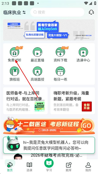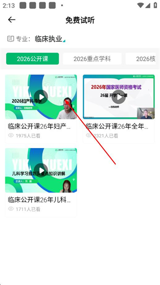 1、在醫(yī)學(xué)微課堂app的首頁,點(diǎn)擊免費(fèi)試聽選項(xiàng)。