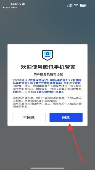 1、打開騰訊手機管家APP,進入時會彈出用戶服務及隱私協(xié)議,點擊同意的按鈕。