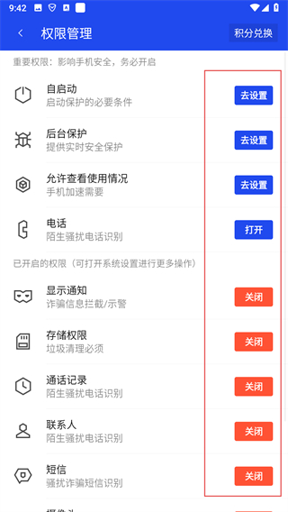 4、可對各項權(quán)限進行操作,點擊對應權(quán)限右側(cè)的去設置或打開關閉按鈕。