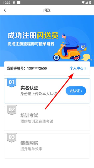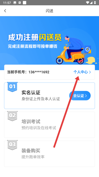 1、在閃送員app界面點(diǎn)擊個(gè)人中心選項(xiàng),進(jìn)入個(gè)人中心頁面。