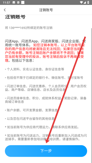 3、在注銷賬號(hào)頁面中,了解完詳情后點(diǎn)擊下一步按鈕開始注銷。