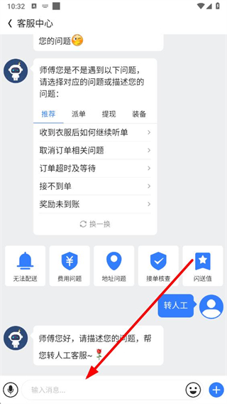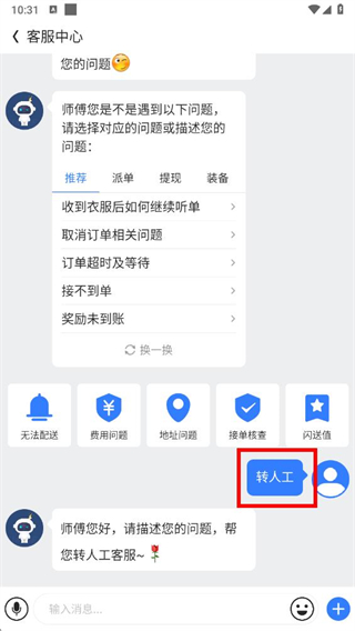 3、在客服頁面可選擇智能客服推薦問題,或發(fā)送轉(zhuǎn)人工聯(lián)系人工客服。