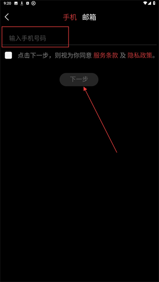 3、在手機(jī)注冊(cè)的界面內(nèi),輸入要注冊(cè)的手機(jī)號(hào)并點(diǎn)擊下一步。