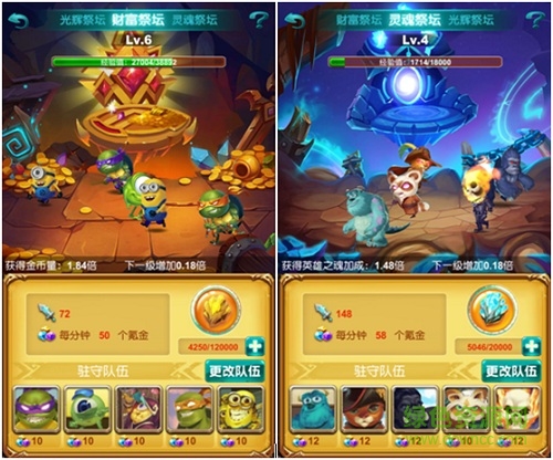 首先是祭壇玩法,游戲中分為財富、靈魂、光輝三個祭壇,產(chǎn)出各不相同,分別從金錢、英雄之魂及圣光三個方面降低游戲難度??赏ㄟ^寵物駐守獲得相應資源提升祭壇等級,祭壇的等級越高獲得的效果將成倍增長。當祭壇達到8級之后將開啟掠奪玩法,資源掠奪需要你的魔寵參與戰(zhàn)斗。