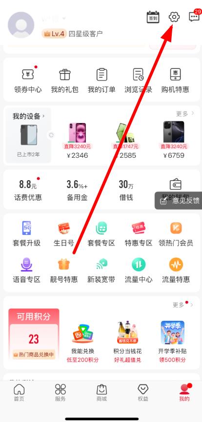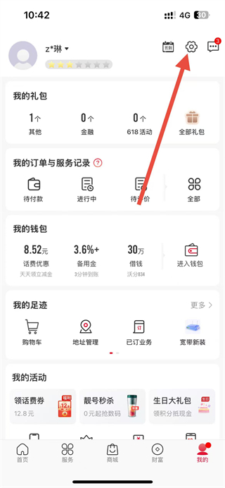 1、在中國(guó)聯(lián)通app個(gè)人頁(yè)面點(diǎn)擊右上角設(shè)置圖標(biāo),進(jìn)入設(shè)置頁(yè)面。