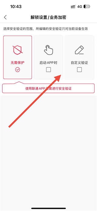 4、在解鎖設(shè)置頁(yè)面選擇啟動(dòng)APP時(shí)等驗(yàn)證方式,按提示設(shè)置解鎖密碼,完成解鎖密碼設(shè)置操作。