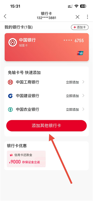 3、在銀行卡頁(yè)面,點(diǎn)擊添加其他銀行卡選項(xiàng),進(jìn)入添加銀行卡頁(yè)面。