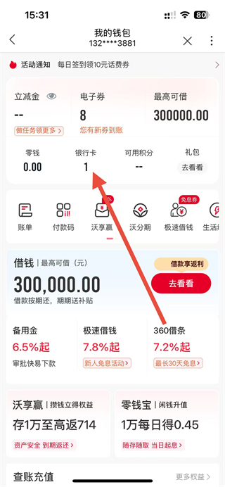 2、在我的錢包頁(yè)面,點(diǎn)擊銀行卡選項(xiàng),進(jìn)入銀行卡頁(yè)面。