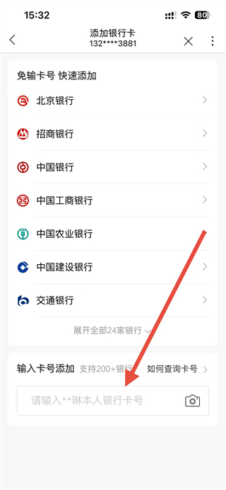 4、在添加銀行卡頁(yè)面,輸入本人銀行卡號(hào),按提示完成后續(xù)操作,即可添加其他銀行卡。