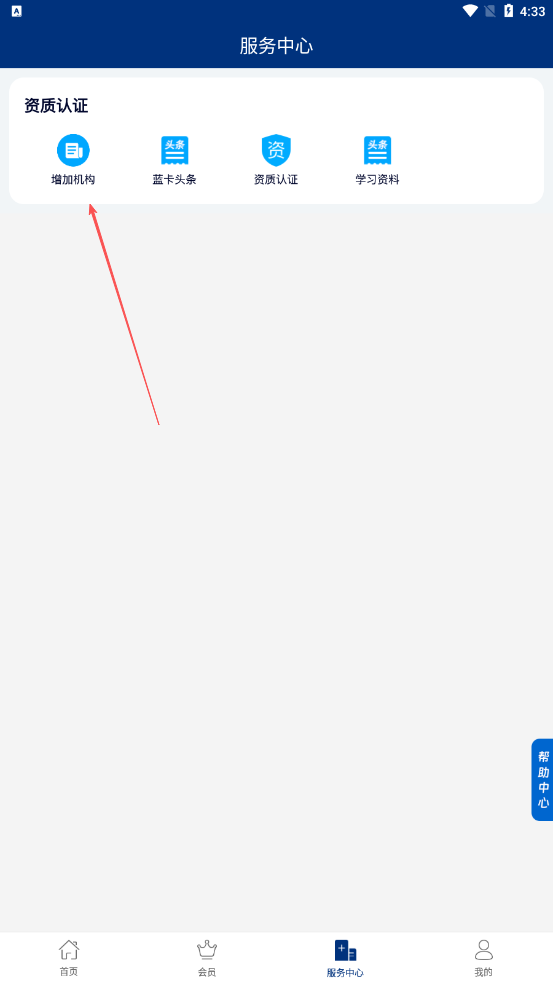 2、在服務(wù)中心頁面,找到資質(zhì)認(rèn)證板塊,點(diǎn)擊增加機(jī)構(gòu)按鈕。