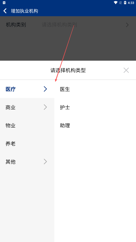 3、進(jìn)入增加執(zhí)業(yè)機(jī)構(gòu)頁面后,點(diǎn)擊機(jī)構(gòu)類別選項(xiàng),在彈出的列表中選擇對應(yīng)的機(jī)構(gòu)類型。