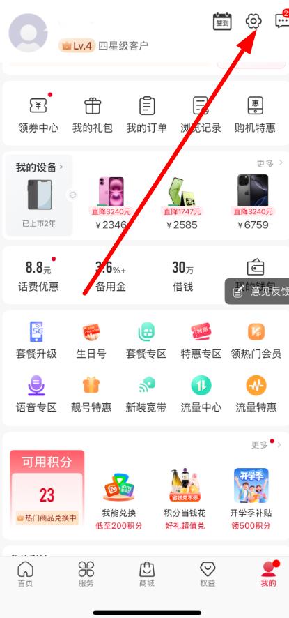 1、打開(kāi)中國(guó)聯(lián)通app,點(diǎn)擊底部導(dǎo)航欄我的,再點(diǎn)擊右上角設(shè)置圖標(biāo)。