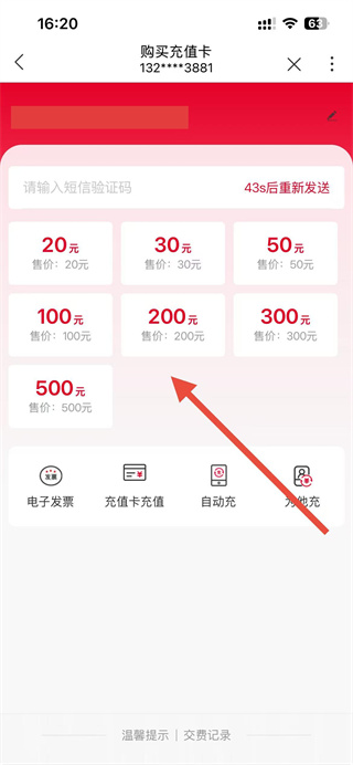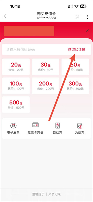 3、在購(gòu)買(mǎi)充值卡界面,點(diǎn)擊獲取驗(yàn)證碼,輸入驗(yàn)證碼驗(yàn)證。