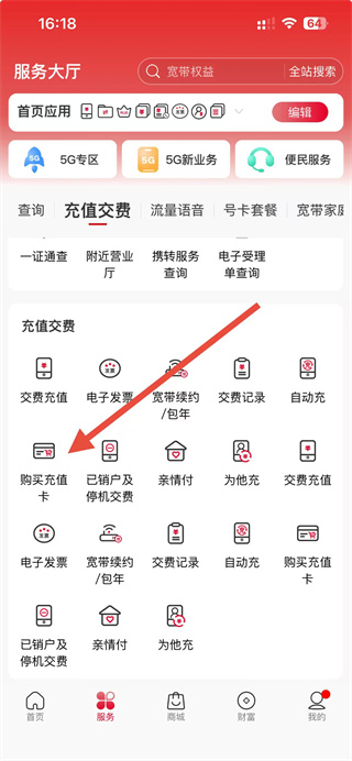 2、在服務(wù)大廳界面,找到購(gòu)買(mǎi)充值卡選項(xiàng)并點(diǎn)擊,進(jìn)入購(gòu)買(mǎi)充值卡界面。