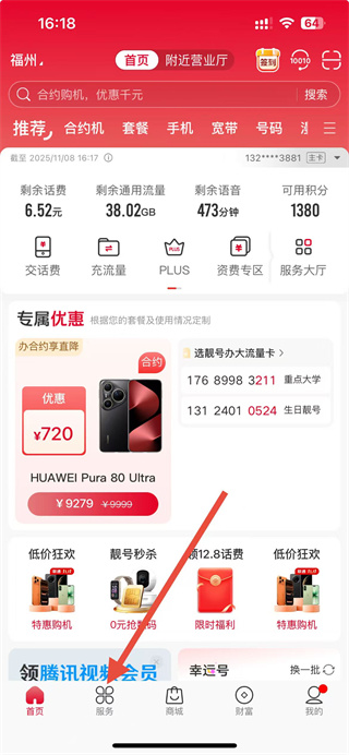 1、在中國(guó)聯(lián)通App界面,點(diǎn)擊下方服務(wù)選項(xiàng),進(jìn)入服務(wù)大廳界面。