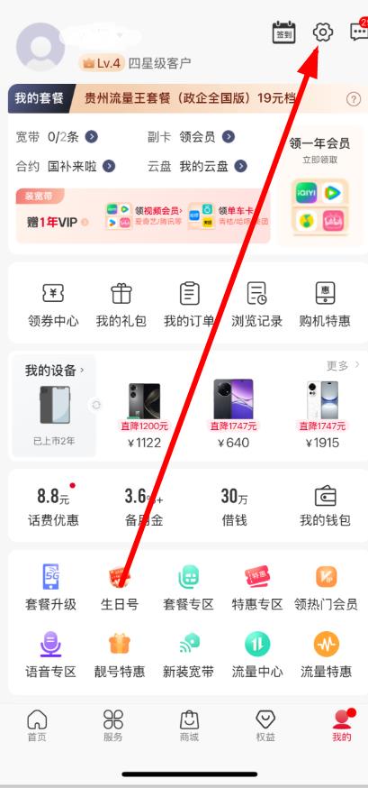 1、打開中國(guó)聯(lián)通app,進(jìn)入我的頁(yè)面,點(diǎn)擊右上角設(shè)置圖標(biāo)。