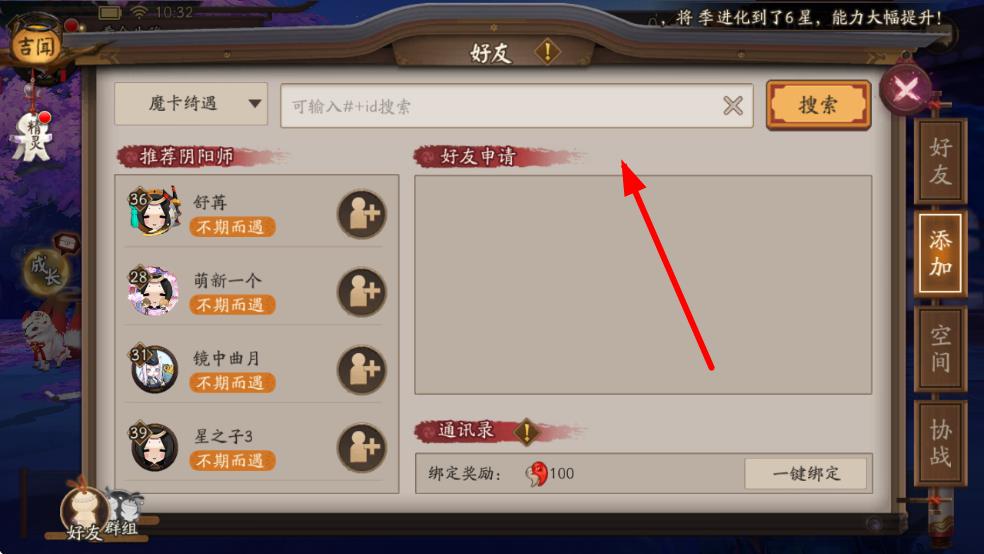 3、在添加好友界面,可以通過輸入id進行搜索,或者點擊推薦陰陽師后的加好友按鈕來添加好友。