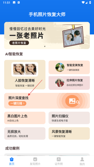 1、打開(kāi)手機(jī)照片恢復(fù)大師應(yīng)用,在首頁(yè)找到照片深度查找模塊并點(diǎn)擊,進(jìn)入照片深度掃描界面。