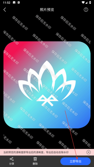 3、確認(rèn)后點(diǎn)擊右下角藍(lán)色立即導(dǎo)出按鈕,即可將圖片保存至手機(jī)。
