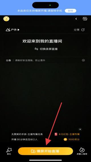 4、在此頁面內(nèi),可點(diǎn)擊橫屏開始直播的功能按鈕即可開始直播。