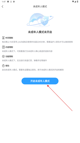4、在該頁面內(nèi),點擊下方開啟未成年人模式即可。
