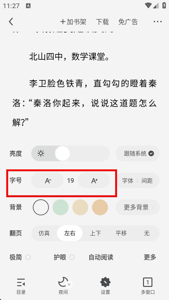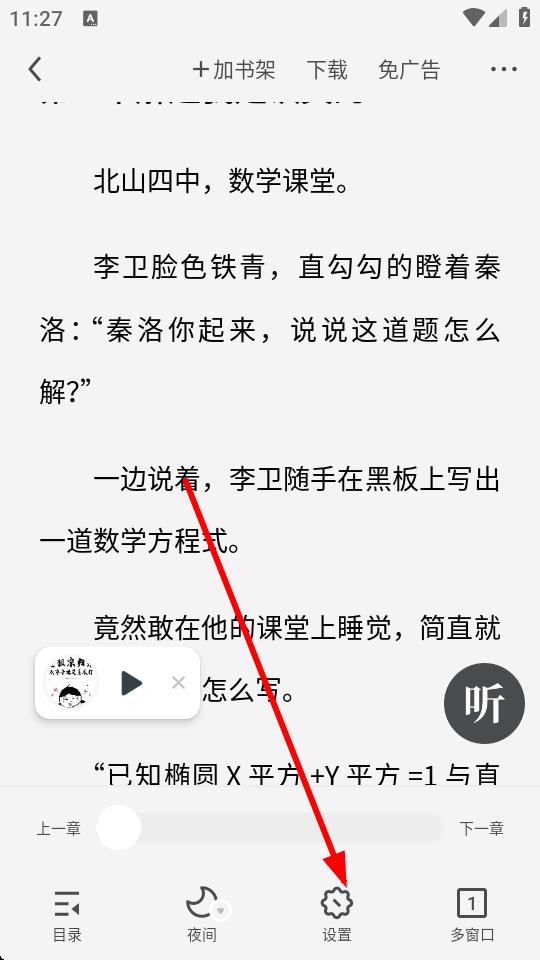 2、進(jìn)入小說閱讀界面后,點擊屏幕中間位置喚出隱藏菜單,點擊底部菜單中的設(shè)置選項。