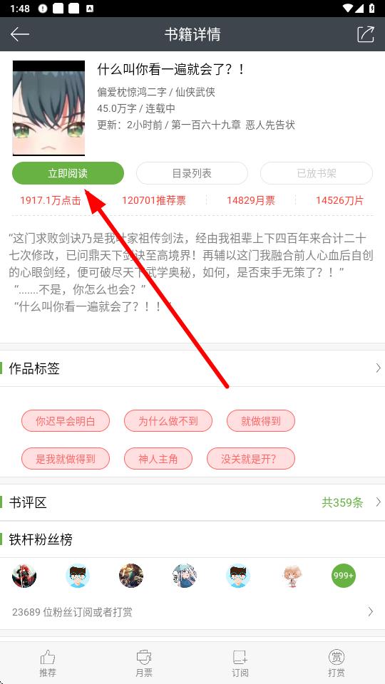 1、在歡樂(lè)書(shū)客中找到想要閱讀的小說(shuō),進(jìn)入其書(shū)籍詳情頁(yè)面點(diǎn)擊立即閱讀。