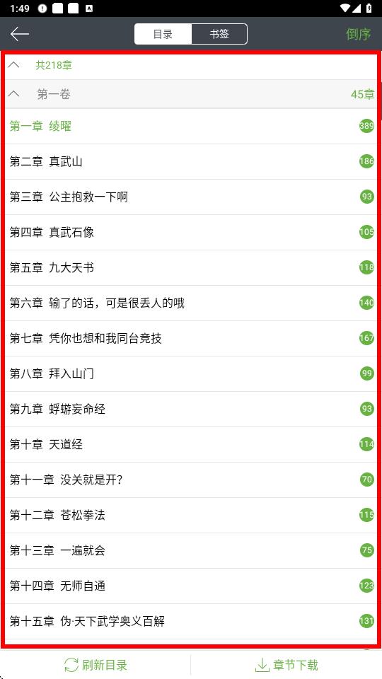 3、在彈出的目錄界面中,即可查看該小說(shuō)的完整版目錄,點(diǎn)擊相應(yīng)章節(jié)標(biāo)題就能跳轉(zhuǎn)閱讀。