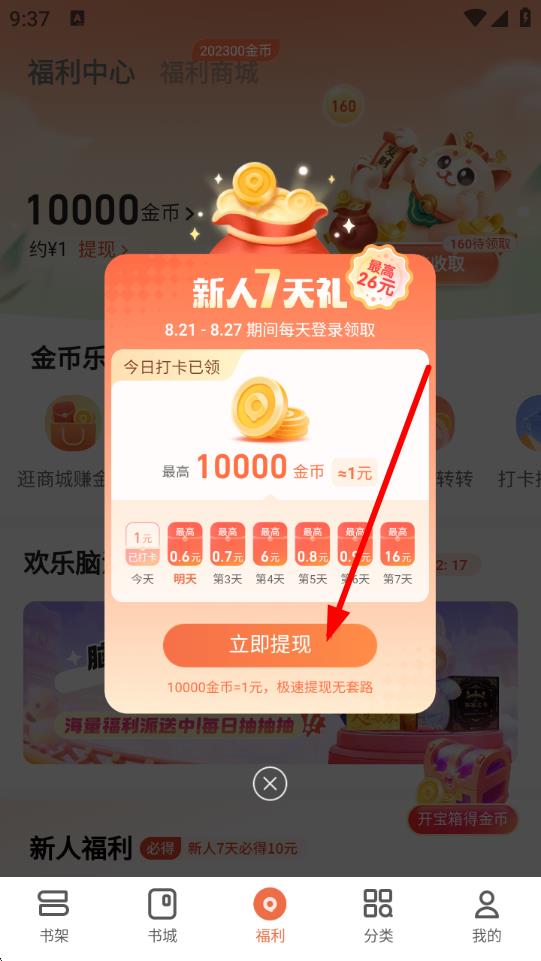2、在福利中心,通過完成閱讀任務(wù)、打卡簽到等方式積累金幣,當(dāng)積累到一定數(shù)量 ,會(huì)彈出相關(guān)提現(xiàn)提示,點(diǎn)擊立即提現(xiàn)按鈕。