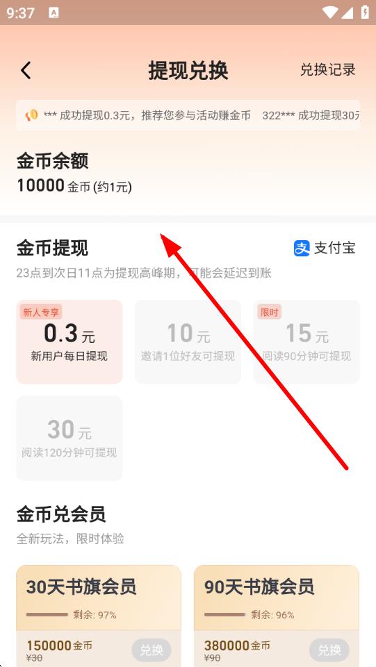 3、進(jìn)入提現(xiàn)兌換頁面后,查看金幣余額,選擇符合提現(xiàn)條件的金額選項(xiàng),如新人專享的0.3元,按照提示操作完成提現(xiàn),將金幣兌換成現(xiàn)金轉(zhuǎn)入綁定的支付賬戶。