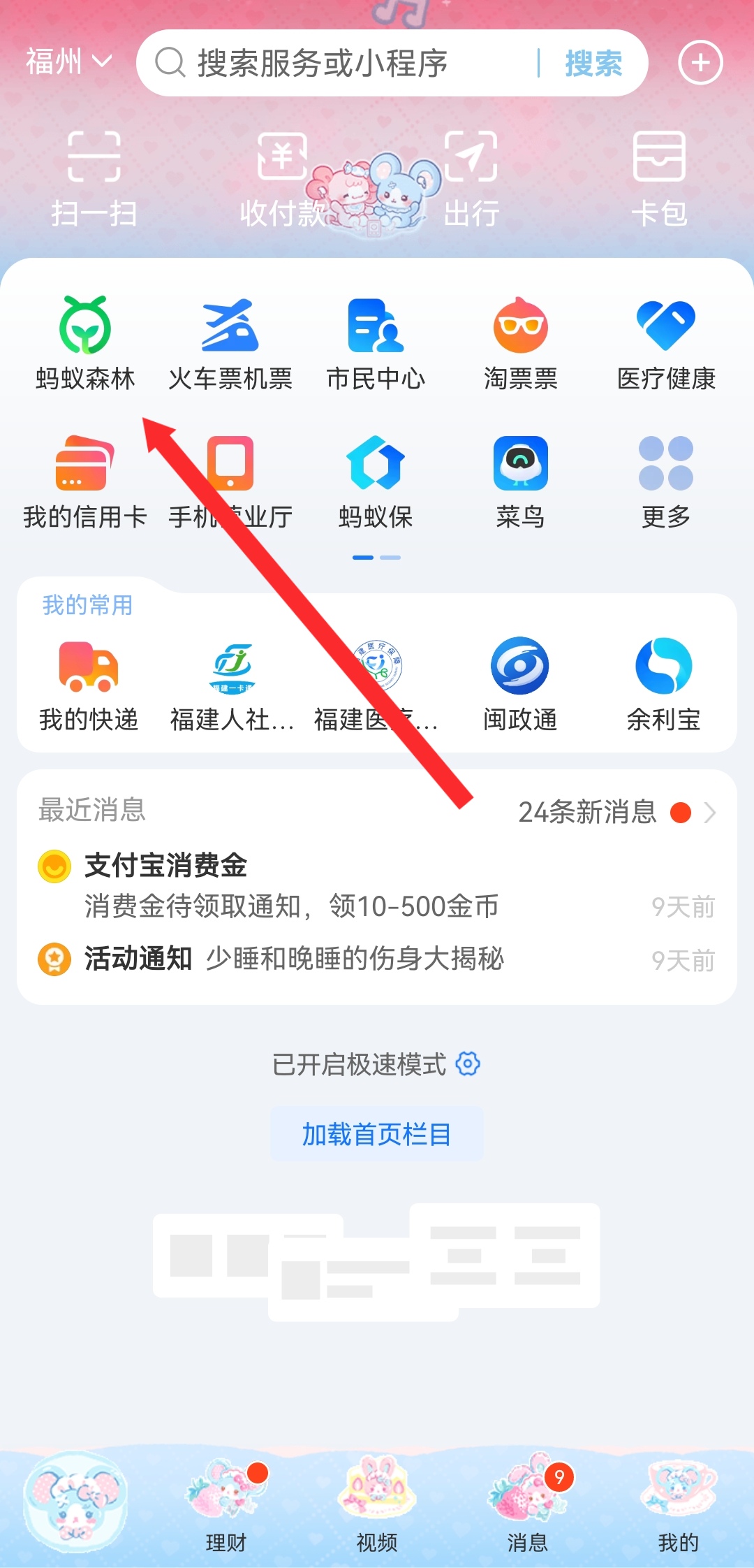 1、在支付寶的首頁(yè),需要點(diǎn)擊螞蟻森林,進(jìn)入螞蟻森林界面。