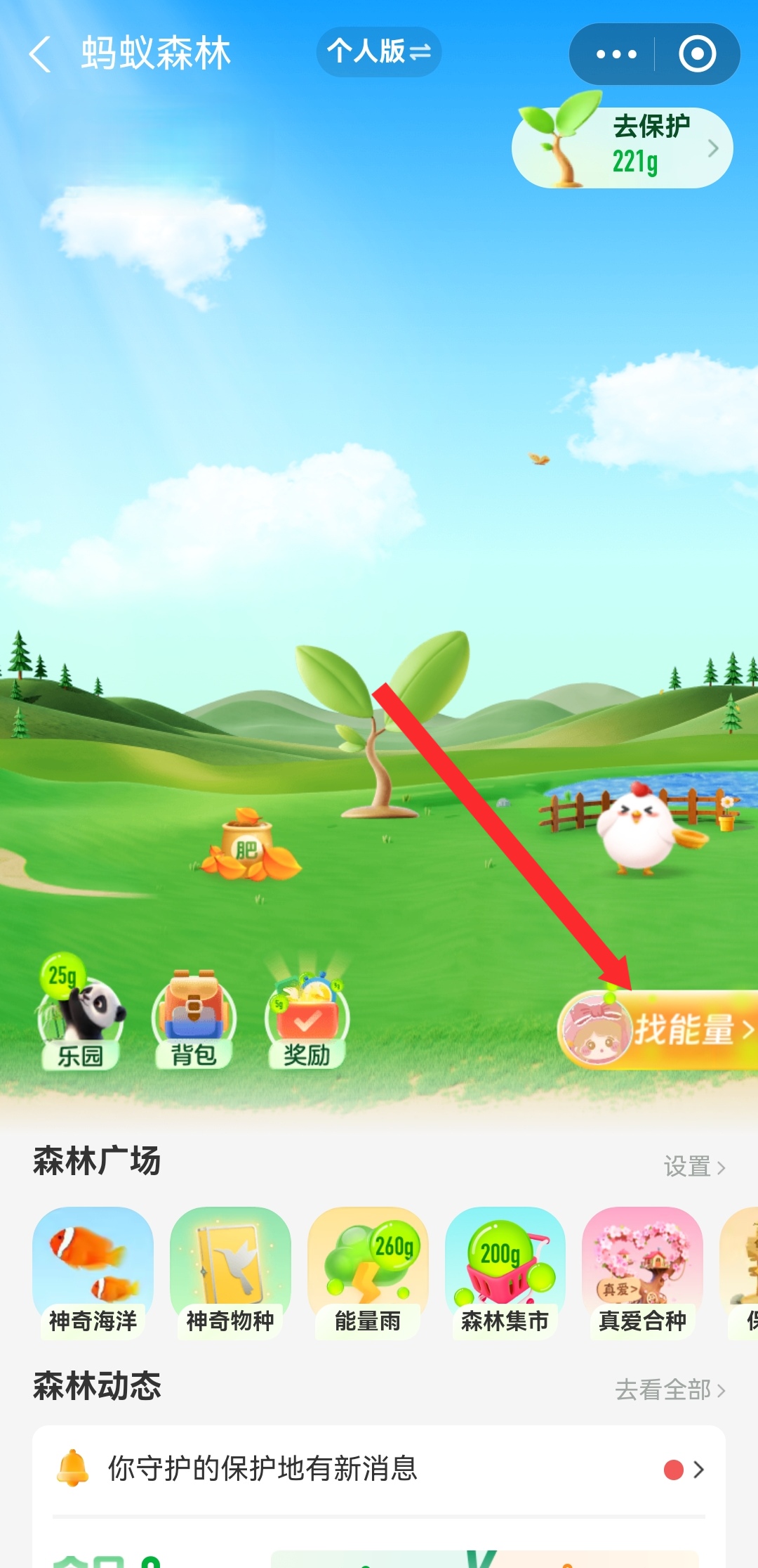 2、在螞蟻森林界面,點(diǎn)擊找能量按鈕,進(jìn)入好友的螞蟻森林。