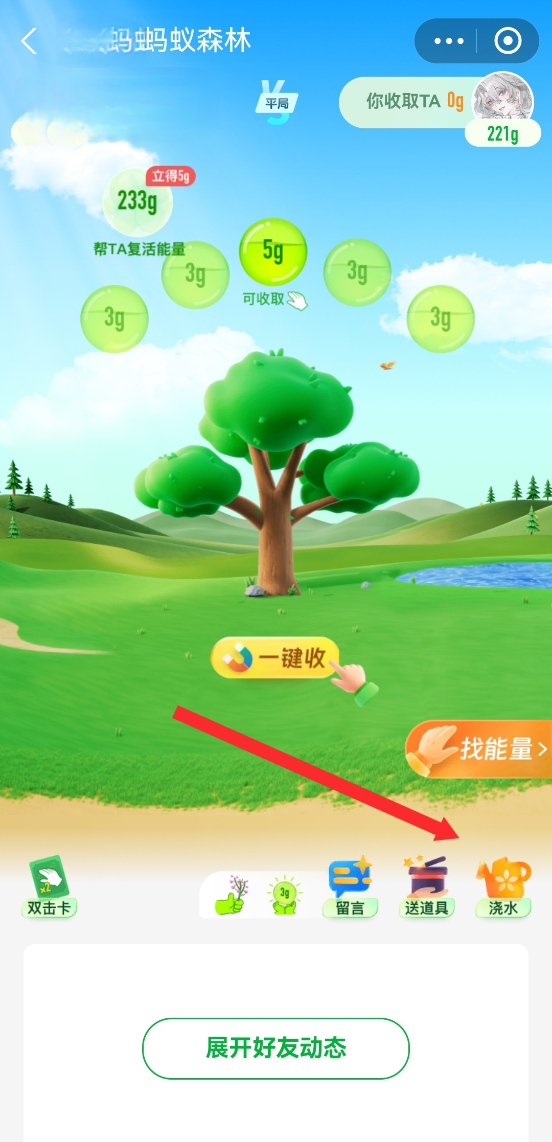 3、在好友的螞蟻森林界面,點(diǎn)擊澆水,進(jìn)入澆水克數(shù)選擇頁(yè)面。