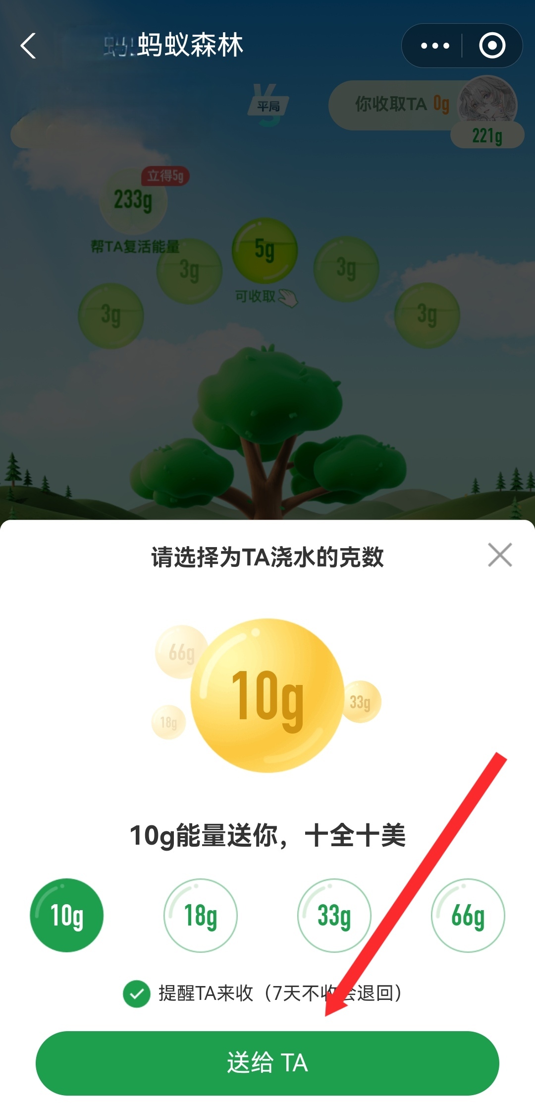 4、在選擇頁(yè)面,選擇澆水克數(shù)后點(diǎn)擊送給TA,完成給好友澆水操作。